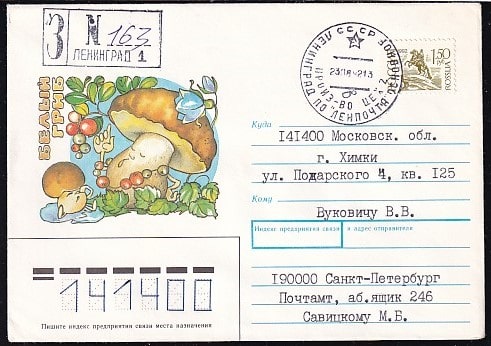 Конверт Белый гриб (разные номера на штемпеле заказное Ленинград). Выпуск 16.04.1991 год, прошел почту