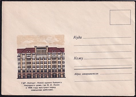 Конверт ГДР. Лейпциг. Здание Народного дома, где выступал В.И. Ленин. Выпуск 20.02.1969 год