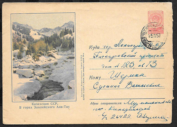 Конверт Казахская ССР. В горах Заилийского Ала-Тау прошел почту 1957 г.