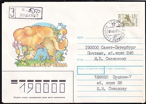 Конверт Лисичка (разные номера на штемпеле заказное Пушкин). Выпуск 16.04.1991 год, прошел почту