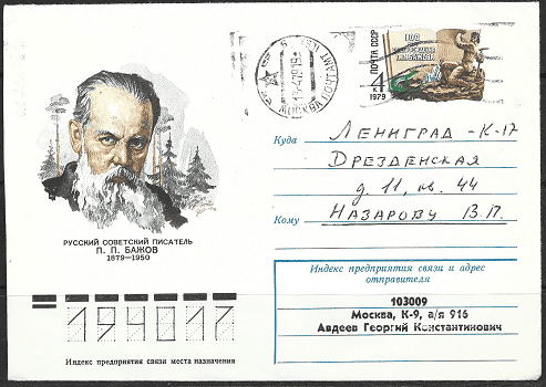 Конверт Русский советский писатель П.П.Бажов. 28.11.1978 Прошёл почту