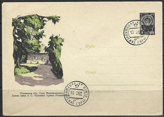 Конверт с гашением. Псковская область. Домик няни А.С. Пушкина, 9.01.1962 год