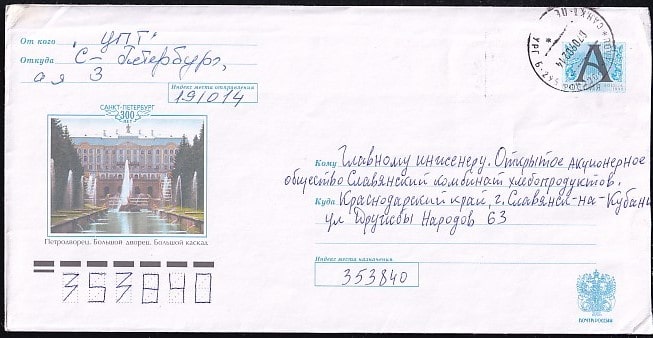Конверт с лит. А Петродворец. Большой дворец. Большой каскад, 2002 год, прошел почту