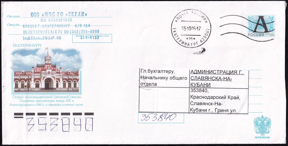 Конверт с литерой "А" - Екатеринбург. Старый железнодорожный (воинский) вокзал, 2005 год, прошёл почту