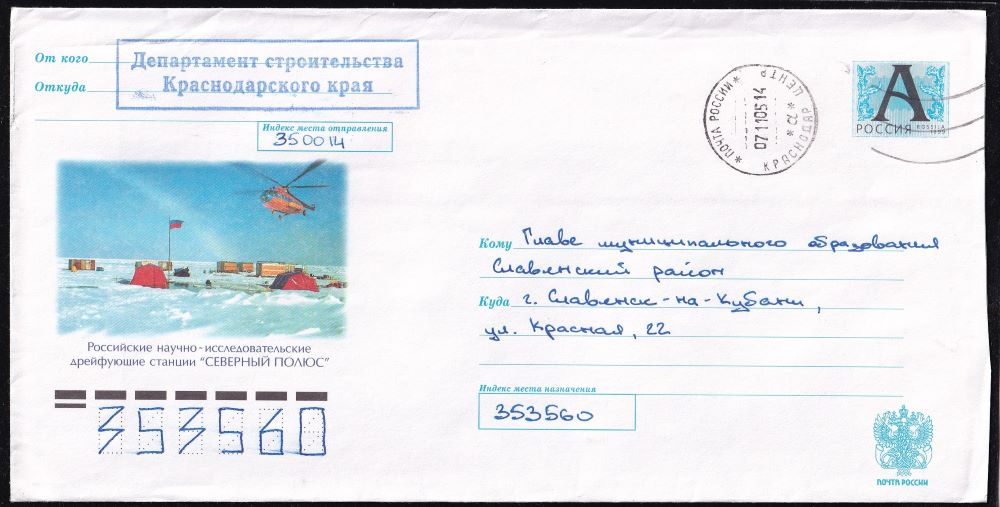 Конверт с литерой "А" - Российские научно-исследовательские дрейфующие станции "Северный полюс", 5.06.2005 год, прошёл почту