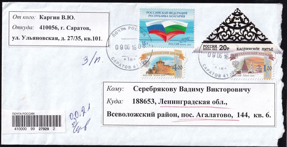 Конверт с марками Каслинское литье. Республика Болгария, Нижегородский кремль 2016 год, прошёл почту