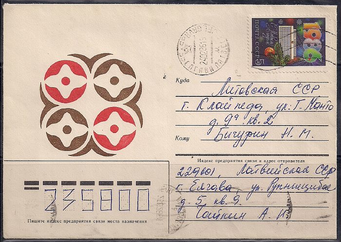 Конверт с маркой. Латвийская ССР. С Новым 1986 годом! 1985 год, прошел почту
