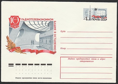 Конверт с ОМ. 10 лет радиотелевизионной башне в Останкино. 20.09.1977 год. космос