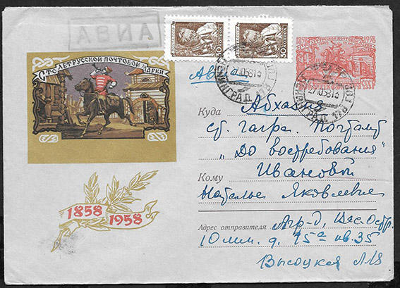 Конверт с ОМ 100 лет русской почтовой марки, прошел почту 1958 год