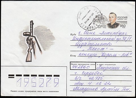 Конверт с ОМ. 100 лет со дня рождения конструктора Г.С. Шпагина, 12.03.1997 год, прошёл почту