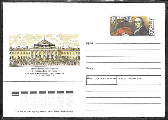 Конверт с ОМ - 250 лет со дня рождения Н.И. Новикова. 1994 год