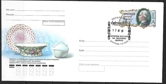 Конверт с ОМ 300 лет со дня рождения Д.И. Виноградова (1720–1758), основоположника производства русского фарфора СГ история России на марках