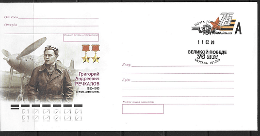 Конверт с ОМ Григорий Речкалов, летчик-истребитель. СГ 75 лет Великой Победе, Москва, 11.02.2020 год