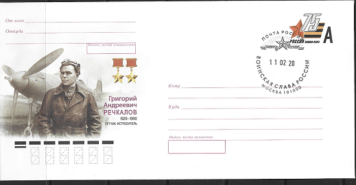 Конверт с ОМ Григорий Речкалов, летчик-истребитель. СГ воинская слава России, Москва, 11.02.2020 год