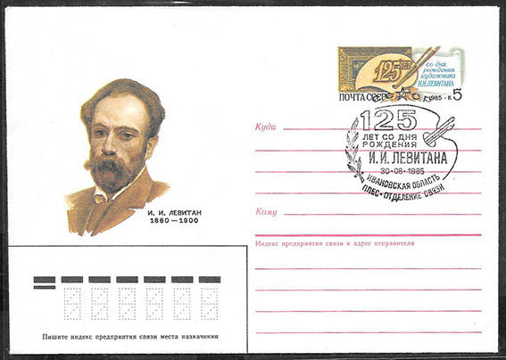Конверт с ОМ и гашением - 125 лет со дня рождения художника И.И. Левитана. Плес. 30,8,1985 год