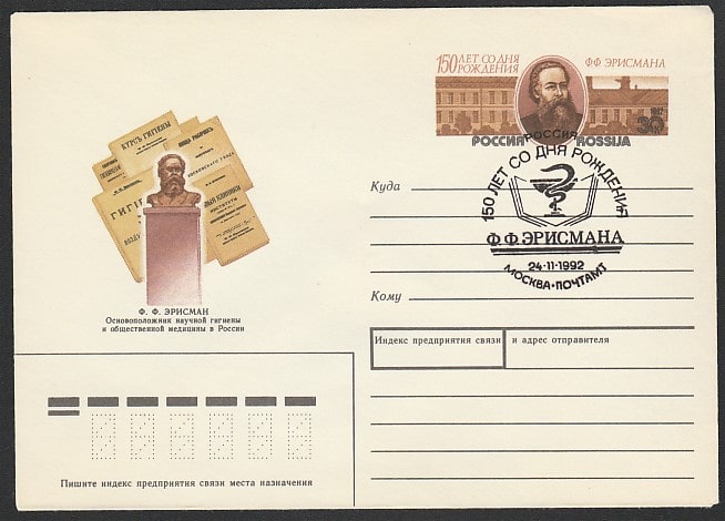 Конверт с ОМ и СГ. 100 лет со дня рождения Ф.Ф. Эрисмана, 24.11.1992 год, Москва