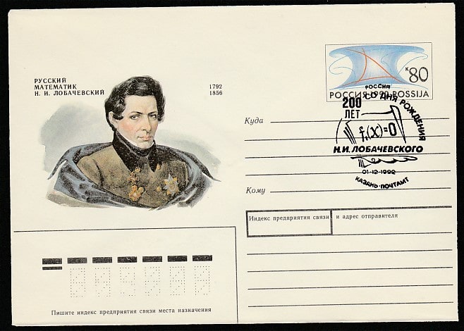 Конверт с ОМ и СГ. 200 лет со дня рождения Н.И. Лобачевского, 01.12.1992 год, Казань