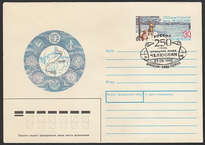 Конверт с ОМ и СГ. 250 лет открытия мыса Челюскин, 23.08.1992 год, Диксон, ус