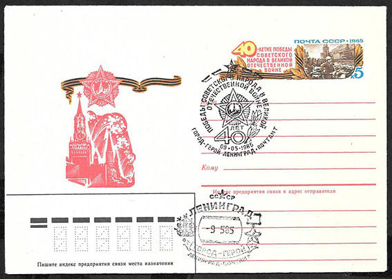 Конверт с ОМ и спецгашением - 40-летие Победы советского народа в ВОВ. Ленинград. 1985 год