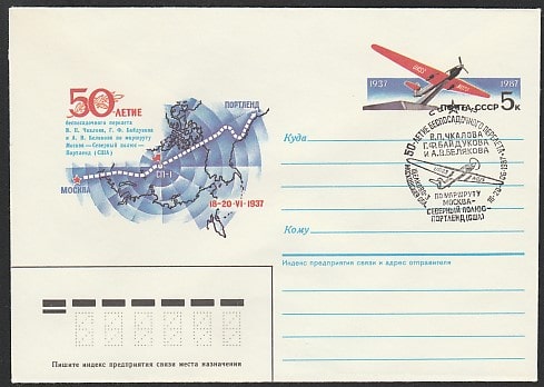 Конверт с ОМ и спецгашением. 50 лет беспосадочному перелёту Москва - Портленд, 18-20.06.1987 год, Щёлково-3 ( 1Ю)