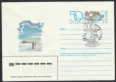Конверт с ОМ и спецгашением. 50 лет научной станции "Северный полюс-1", 21.05.1987 год, Архангельск-61