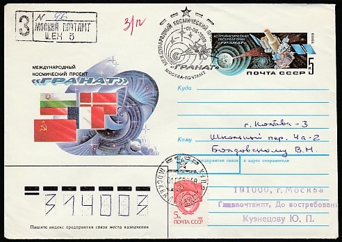 Конверт с ОМ и спецгашением. Международный космический проект "ГРАНАТ", 01.06.1989 год, Москва, почтамт, прошёл почту (+1Ю)
