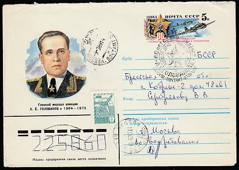 Конверт с ОМ и спецгашением первого дня. 80 лет со дня рождения маршала авиации А.Е. Голованова, 07.08.1984 год, Москва, прошёл почту