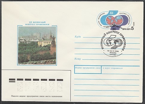 Конверт с ОМ и спецгашением. Всемирный конгресс профсоюзов, 13-20.11.1990 год, Москва, почтамт