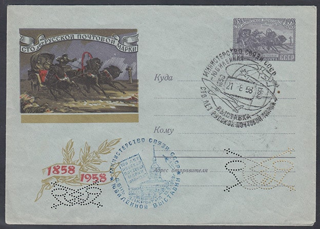 Конверт с ОМ со спецгашением - Сто лет русской почтовой марки, Министерство связи, 21.08.1958 год и с гашением перфорацией