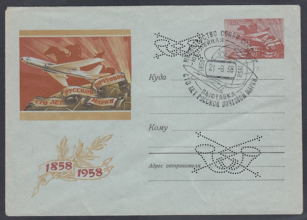 Конверт с ОМ со спецгашением - Сто лет русской почтовой марки, Министерство связи, 21.08.1958 год и с гашением перфорацией