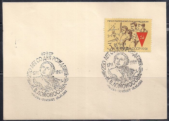 Конверт с СГ. 250 лет со дня рождения М.В. Ломоносова, наклеена марка "Учиться, работать и жить по-коммунистически", 19.11.1961 год, Москва почтамт