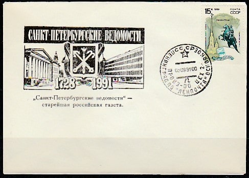 Конверт. "Санкт-Петербургские ведомости" - старейшая российская газета, 1991 год (штемпель гашения)