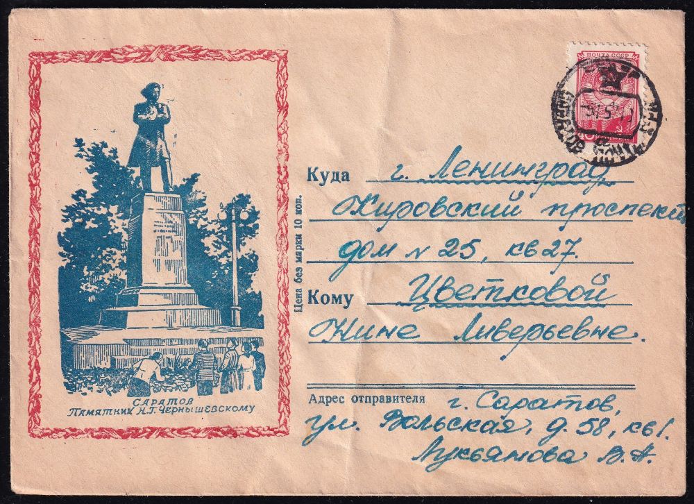 Конверт Саратов. Памятник Н. Г. Чернышевскому, 9.01.1957 год, прошел почту