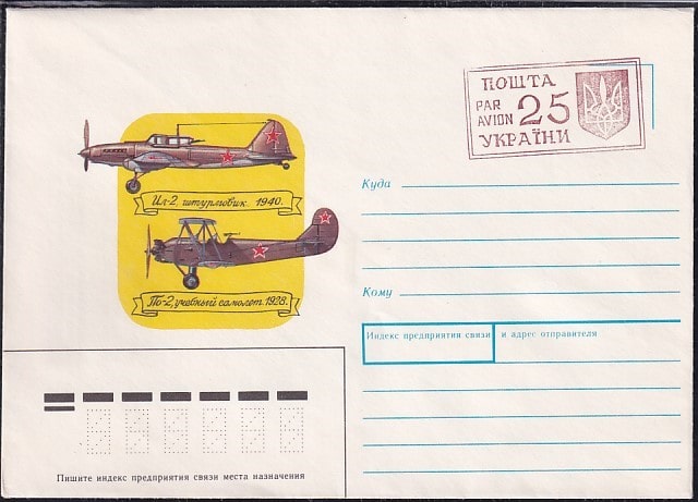 Конверт Штурмовик Ил-2. Учебный самолет По-2 (надпечатка Почта Украины 25). Выпуск 28.07.1989 год (ВВ)