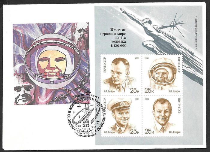 Конверт со СГ- 30 лет первому полету человека в космос. Звездный городок 12.04.1991 г. ( 3Ю)