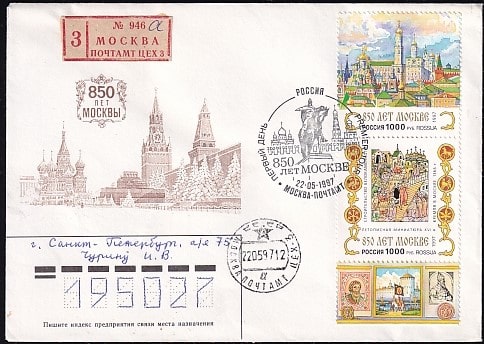 Конверт со СГ "850 лет Москве" (строительство Кремля), 22.05.1997 год, прошел почту