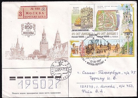 Конверт со СГ "850 лет Москве" (венчание Ивана IV на царство), 22.05.1997 год, прошел почту