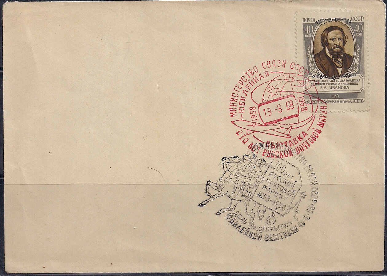 Конверт со СГ. Юбилейная выставка "100 лет русской почтовой марки", 1958 год, наклеена марка "150 лет со дня рождения художника А.А. Иванова"