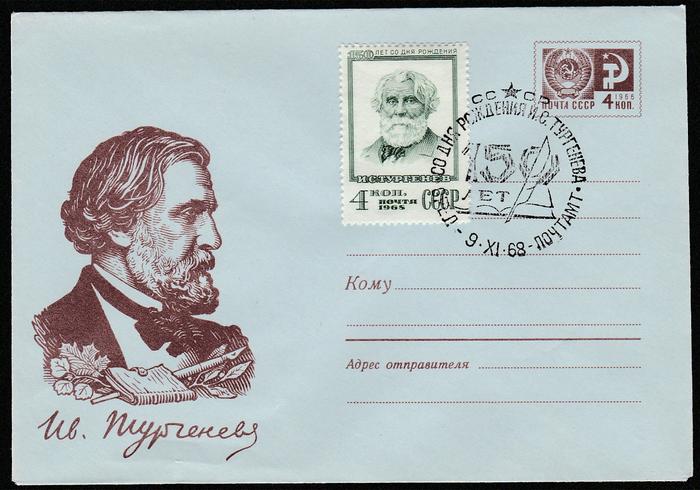 Конверт со спецгашением. 150 лет со дня рождения И.С. Тургенева. 09.11.1968 г.