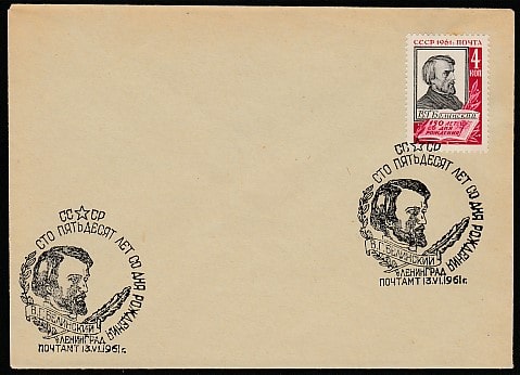 Конверт со спецгашением. 150 лет со дня рождения В.Г. Белинского, 13.06.1961 год, Ленинград, почтамт