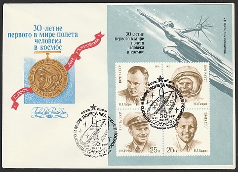Конверт со спецгашением. 30 лет первому в мире полёту человека в космос, 12.04.1991 год, Байконур