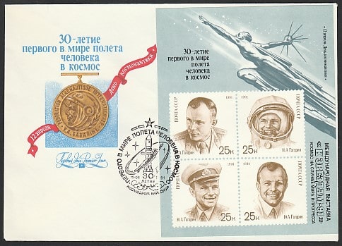 Конверт со спецгашением. 30 лет первому в мире полёту человека в космос, 12.04.1991 год, космодром Байконур (+1Ю)