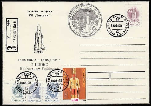 Конверт со спецгашением. 5 лет запуска РН "Энергия", 3 ЦИП КС, 15.05.1992 год, космодром Байконур ( 3Ю)
