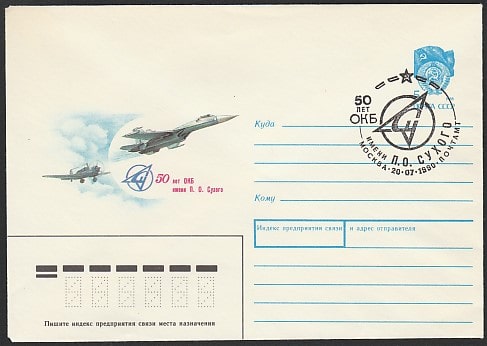 Конверт со спецгашением. 50 лет ОКБ имени П.О. Сухого, 20.07.1990 год, Москва, почтамт (+1Ю)