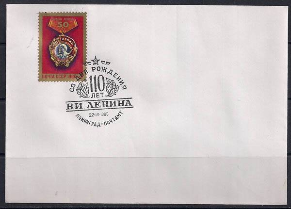 Конверт со спецгашением. 50 лет ордену Ленина. 110 лет со дня рождения В.И. Ленина, 22.04.1980 год, Ленинград почтамт