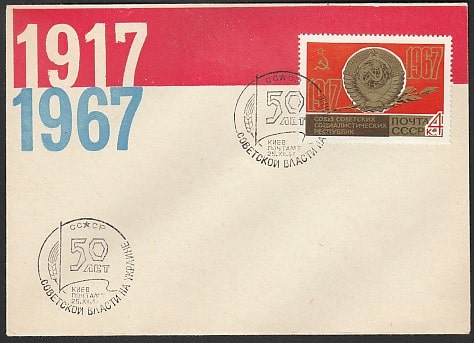 Конверт со спецгашением. 50 лет советской власти на Украине, 25.12.1967 год, Киев, почтамт