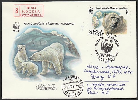 СГ 1987 год › Конверт со спецгашением. Белый медведь, (ном. 20 коп.), 25.03.1987 год, Москва, почтамт, прошёл почту
