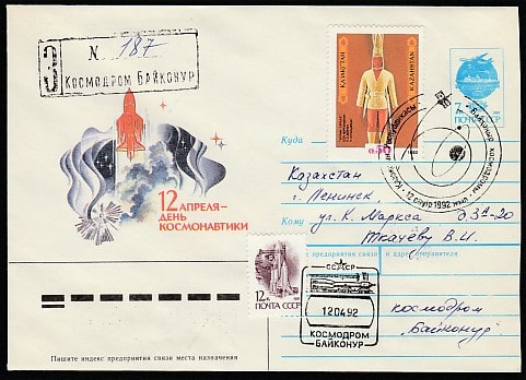 Конверт со спецгашением. День космонавтики, 12.04.1992 год, Казахстан, к/Байконур, прошёл почту (+1Ю)