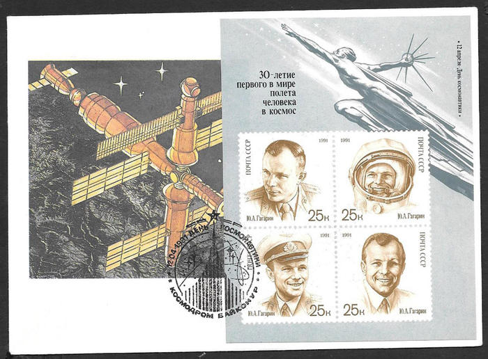 Конверт со спецгашением - День космонавтики. Байконур 12.04.1991 год. тип 1 ( 3Ю)