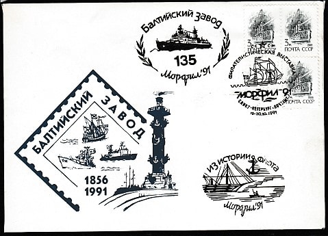 Конверт со спецгашением. Филвыставка "Морфил-91", 12-20.10.1991 год, СПб, почтамт (Ю) КШ: 135 лет Балтийскому заводу, Морфил-91; Из истории флота, Морфил-91.